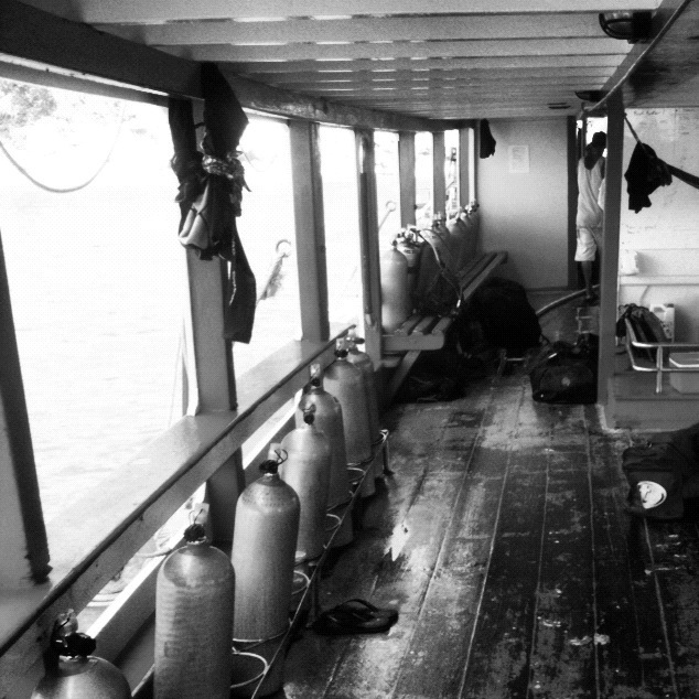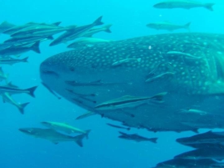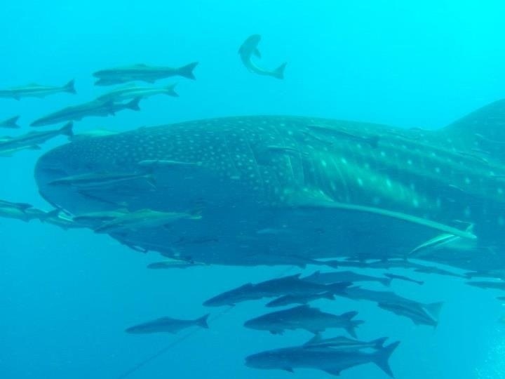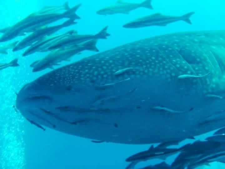 And perhaps nothing sums that up feeling better than the whale sharks. It was a Friday, I can remember that date for once, and to be honest the weather that day was pretty horrible. Thick greasy storm clouds oozing across the gulf towards us from the mainland, the nasty sort of drizzle that is cold and unpleasant even when it’s thirty degrees. The sea, a chopped up sort of grey with 3 foot rollers that made getting back on the ladders tantamount to playing chicken with the 60 tonne boat. But who really cares because that afternoon there was talk of whale sharks, and once your 5 metres down the only sign of the oncoming storm heading towards you is the white foam visible from below, billowing about the dark silhouette of the dive boat’s bow as it breaks through each wave and the occasional strobe flash of distant lightning. But beneath the waves it’s calm and clear and there is a weird sense of expectancy in the water like static electricity but maybe that’s just the lightning, but all the same people are looking up for a dark shapes against the surface, rather than down at the reef for the big brown groupers or giant inflated pufferfish and schools of black and white batfish or whatever else on a normal dive would grab the attention.